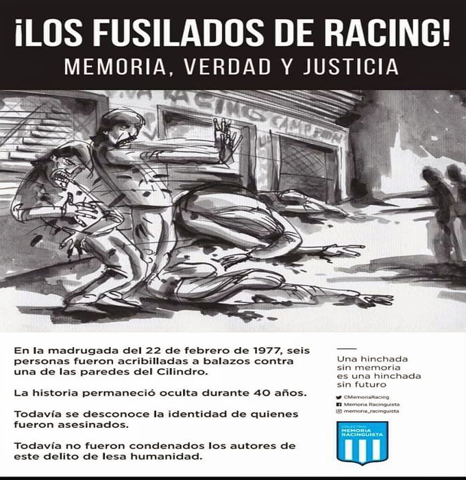 El 27 de febrero de 1977 y dentro del marco del gobierno militar de facto que manejaba el destino de la República Argentina bajo el llamado «Proceso de Reorganización Nacional» extendido desde el 76 hasta el 83, al menos seis personas -cuatro hombres y dos mujeres que hasta el día de hoy no pudieron ser identificados- fueron fusiladas contra uno de los portones del Estadio Presidente Perón de Racing Club. Por las pruebas sumadas al intento de esclarecimiento de los fusilamientos y que fueron aportadas de manera reciente junto a las declaraciones de testigos circunstanciales, se presume que el asesinato se perpetuó frente a la zona limitada entre las puertas 19 y 21. Debido a que la fisionomía del Cilindro era distinta hace 45 años atrás, el perímetro no estaba cerrado como en la actualidad y por lo tanto fue posible acceder hacia esa zona por parte de las fuerzas militares para perpetrar la masacre.